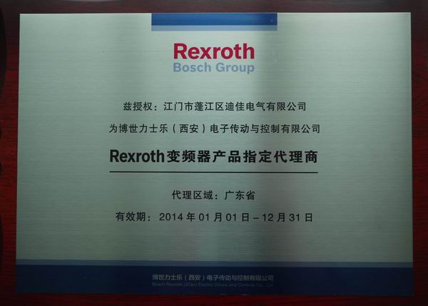 茲授權(quán):江門市蓬江區(qū)迪佳電氣有限公司為博世力士樂(西安)電子傳動(dòng)與控制優(yōu)先公司Rexroth變頻器產(chǎn)品指定代理商
